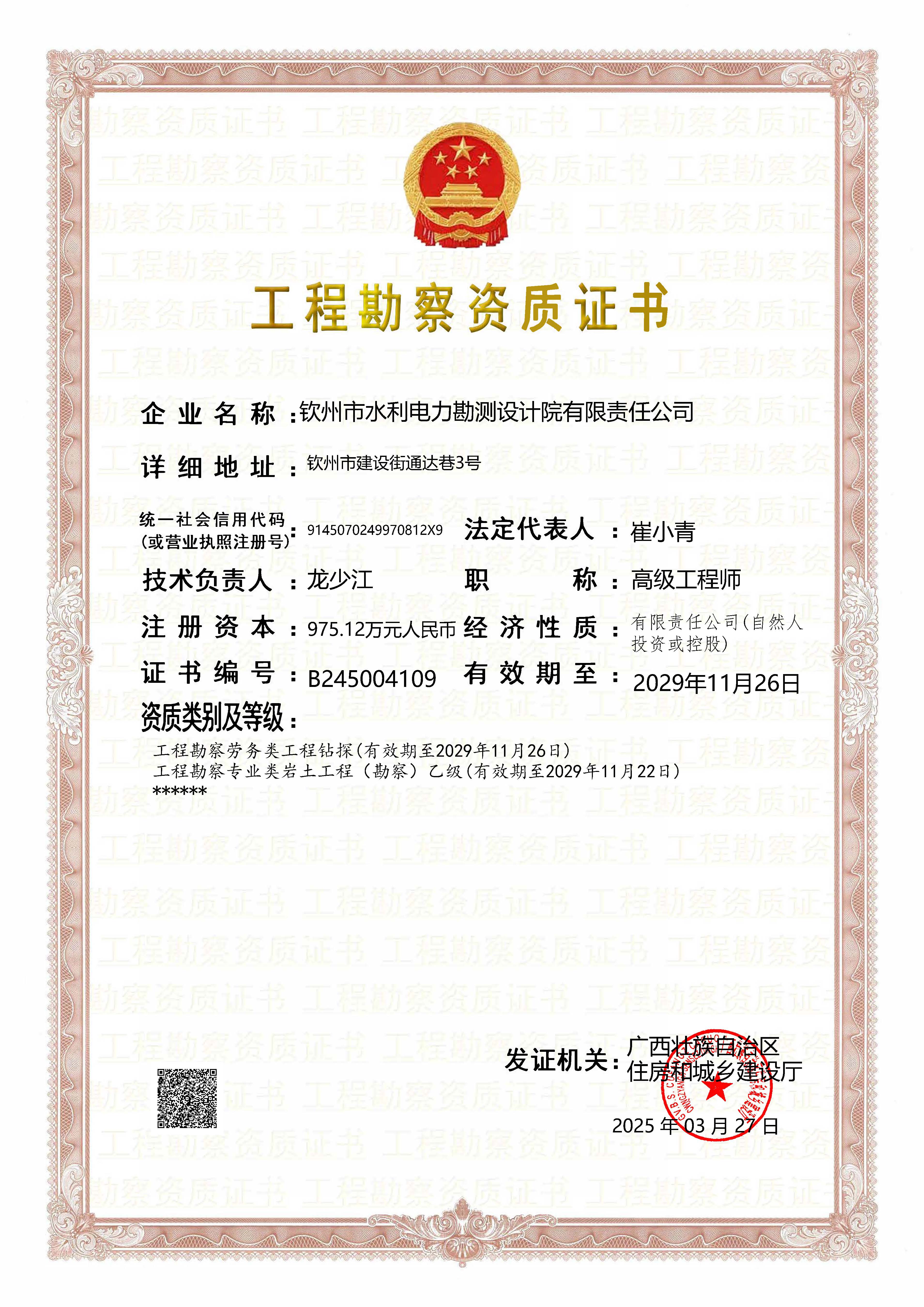 工程勘察乙级资质证书(岩土工程、工程钻探)